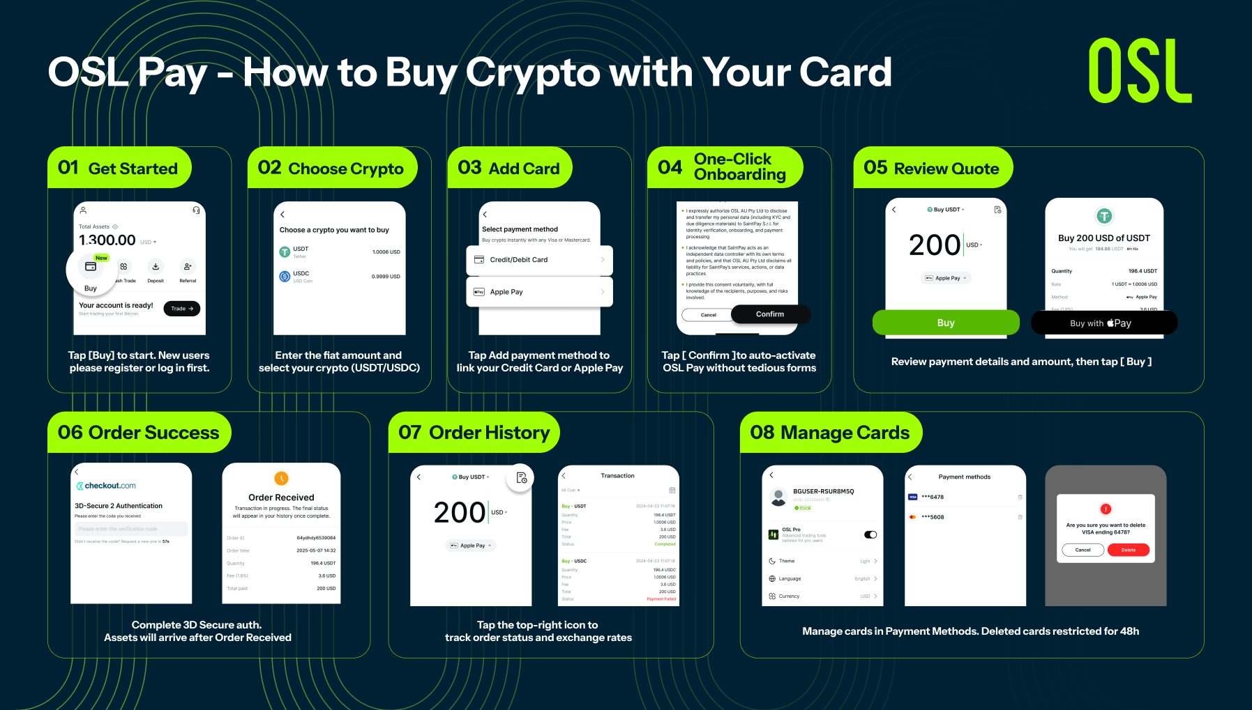 Learn how to use OSL's "One-click to Buy Crypto with Card" feature to instantly purchase USDT/USDC using Visa, Mastercard, or Apple Pay with automatic account creation and zero hidden fees.