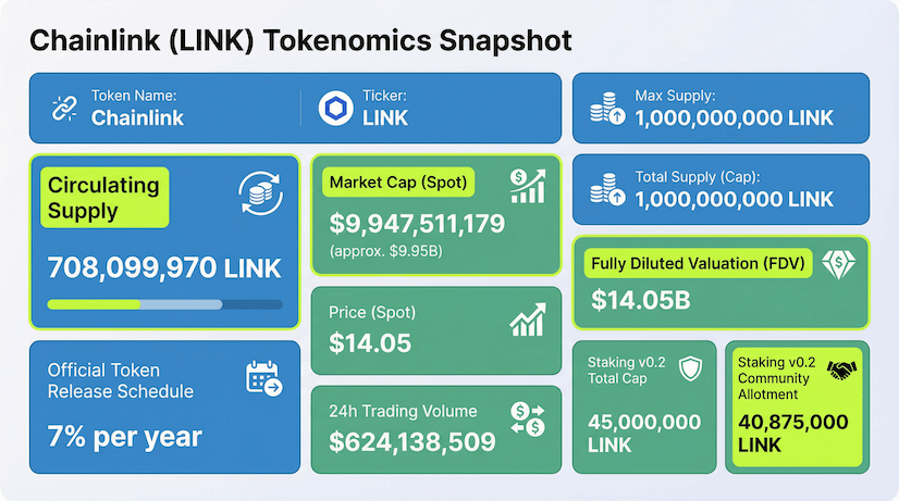 Tokenomics play a central role in framing any long-term discussion around price potential because they shape dilution expectations, liquidity availability, and implied valuation assumptions. Chainlink’s total supply is capped at 1,000,000,000 LINK, and public trackers distinguish between circulating supply and the remaining supply not currently in circulation.