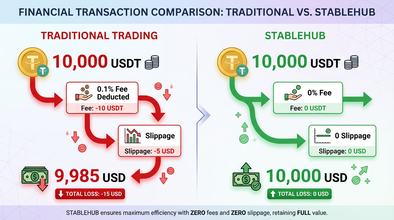 Zero Fees: StableHub waives all fees for supported stablecoin pairs, achieving a truly zero-cost seamless switch.