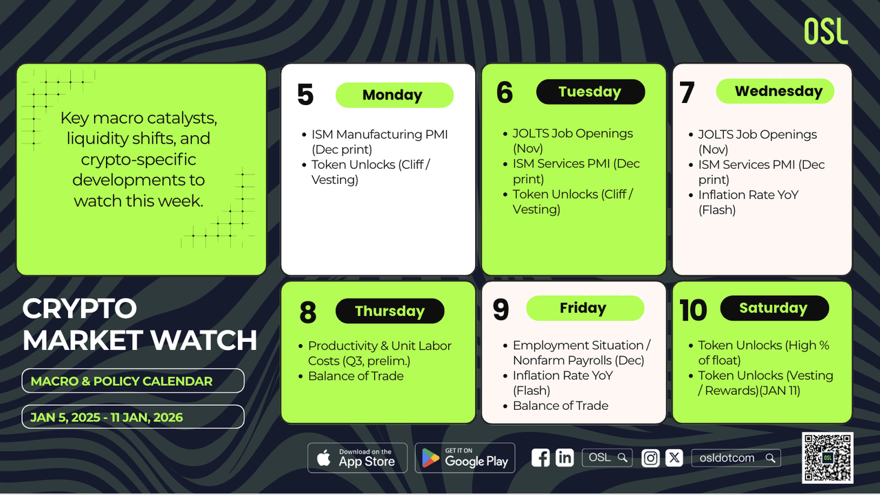 ISM Manufacturing PMI (Dec print) | U.S. | Early-week macro tone setter; can reprice rates and the USD, influencing crypto beta and positioning. | Jan 5 |