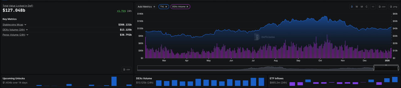 On-chain data reinforces the view that the market is operating in a rotation-driven regime. Aggregate DeFi activity remains resilient, but the composition of that activity points to capital recycling and tactical risk expression, not fresh inflows.