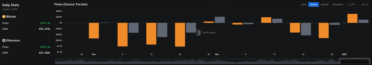 Source: Bitcoin and Ethereum ETF flows on Farside Investors via DeFiLlama (latest available data reflects late-December reporting, January 2, 2025.)