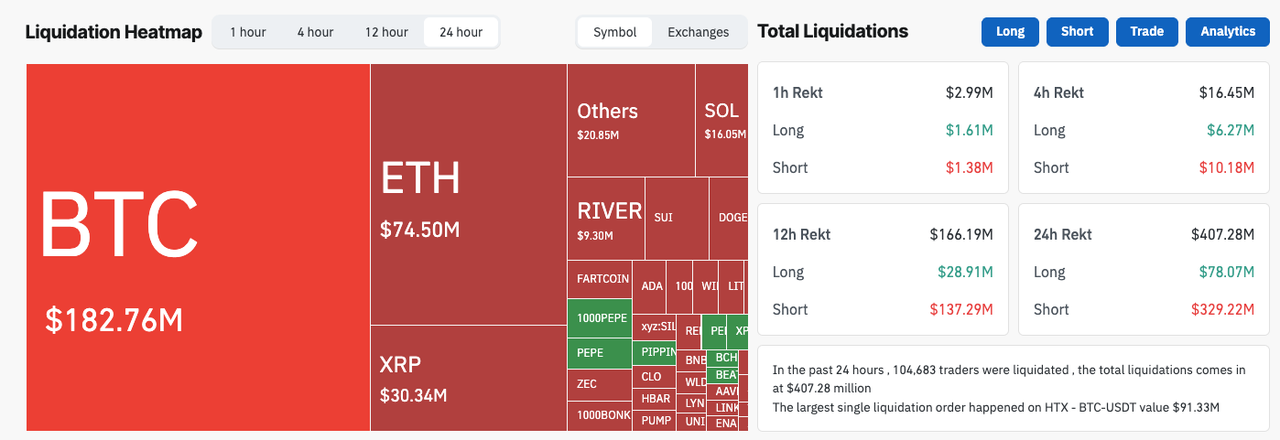 However, this re-leveraging has not occurred in a vacuum. Over the same period, 24-hour liquidations reached roughly US$407.27 million, highlighting the continued fragility of price action when positioning builds faster than underlying liquidity depth.
