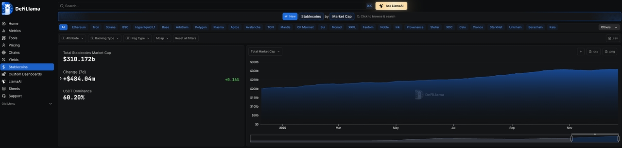 Global stablecoin supply continued to expand, but only marginally, with total stablecoin market capitalization rising to ~US$310.27B (+US$585.46M, +0.19% over 7D).