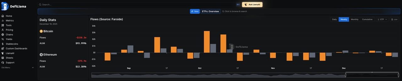 On the ETF front, DeFiLlama's ETF dashboard shows the latest available daily print as of Dec 19, 2025: BTC ETF flows -$158.3M (AUM ~$94.0B) and ETH ETF flows -$75.9M (AUM ~$13.4B). A reminder that, even after earlier stabilization, year-end flow can flip back to risk reduction quickly and should not be extrapolated as a clean trend during holiday weeks.