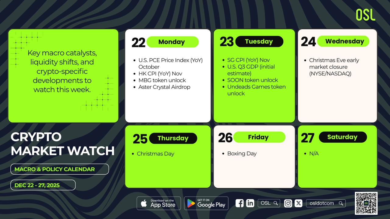 Dec 22–28 is microstructure week. The path of least resistance is range + rotation, with volatility driven by positioning. A true directional move likely needs post-holiday confirmation from ETF flows and broader stablecoin expansion.