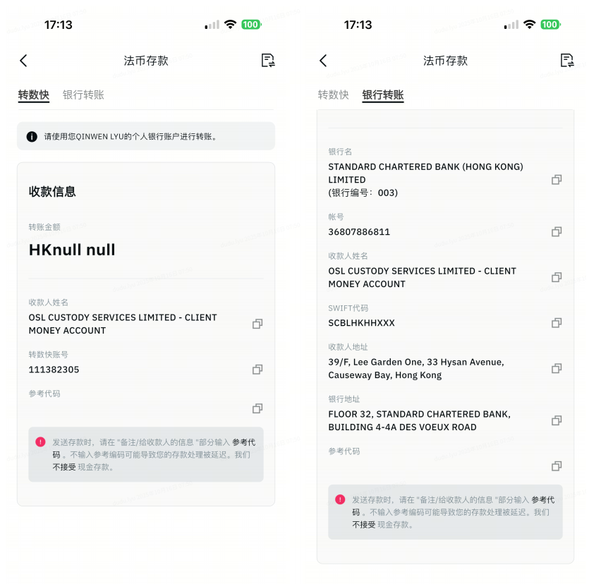 FPS 转数快: 支持香港本地跨行转账,需手动输入 OSL 收款信息及参考代码。