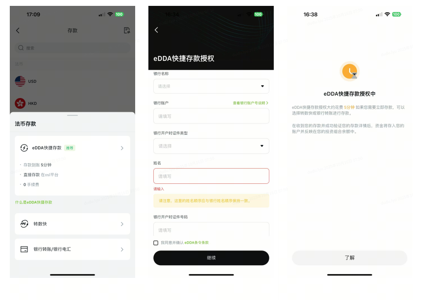 eDDA 快捷存款(首选): 首次授权绑定后,后续入金无需跳转,最快 5 分钟极速到账且免手续费。