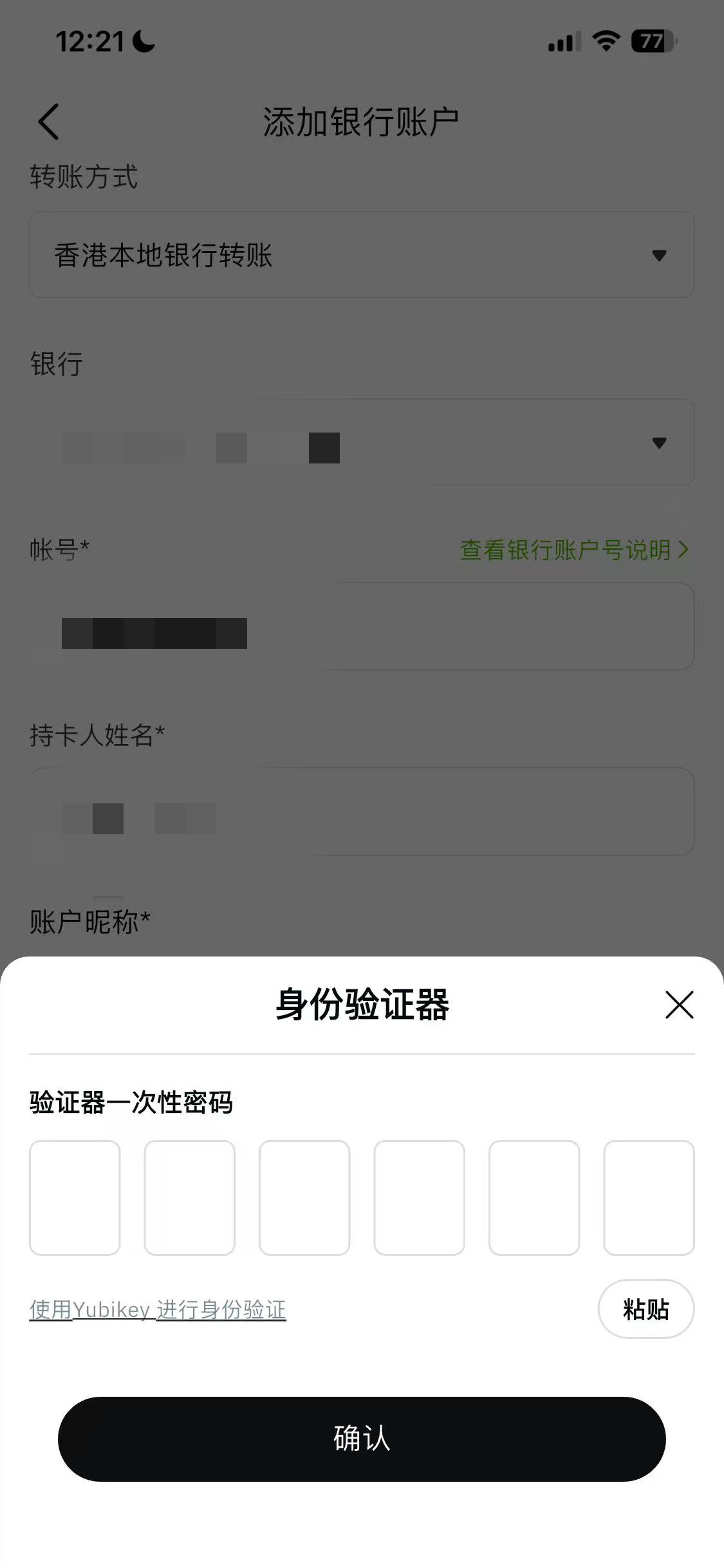 点击“添加新的银行账户”,输入同名银行账号,并配合 2FA (Google Authenticator) 完成安全绑定。