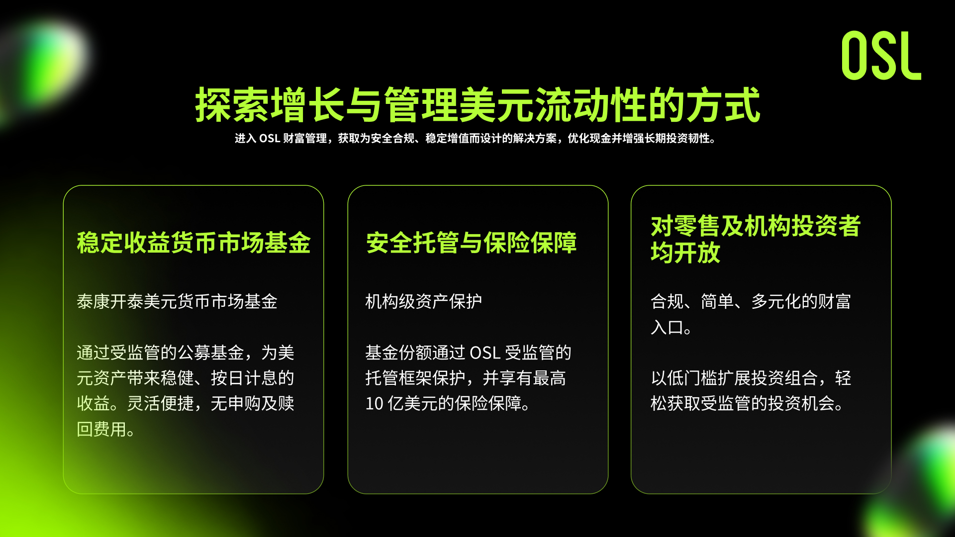 泰康开泰美元货币基金由泰康资产管理(香港)有限公司管理,并经香港证监会(SFC)批准为公募基金。该基金的代币化份额由OSL负责首发上架、代销及托管。