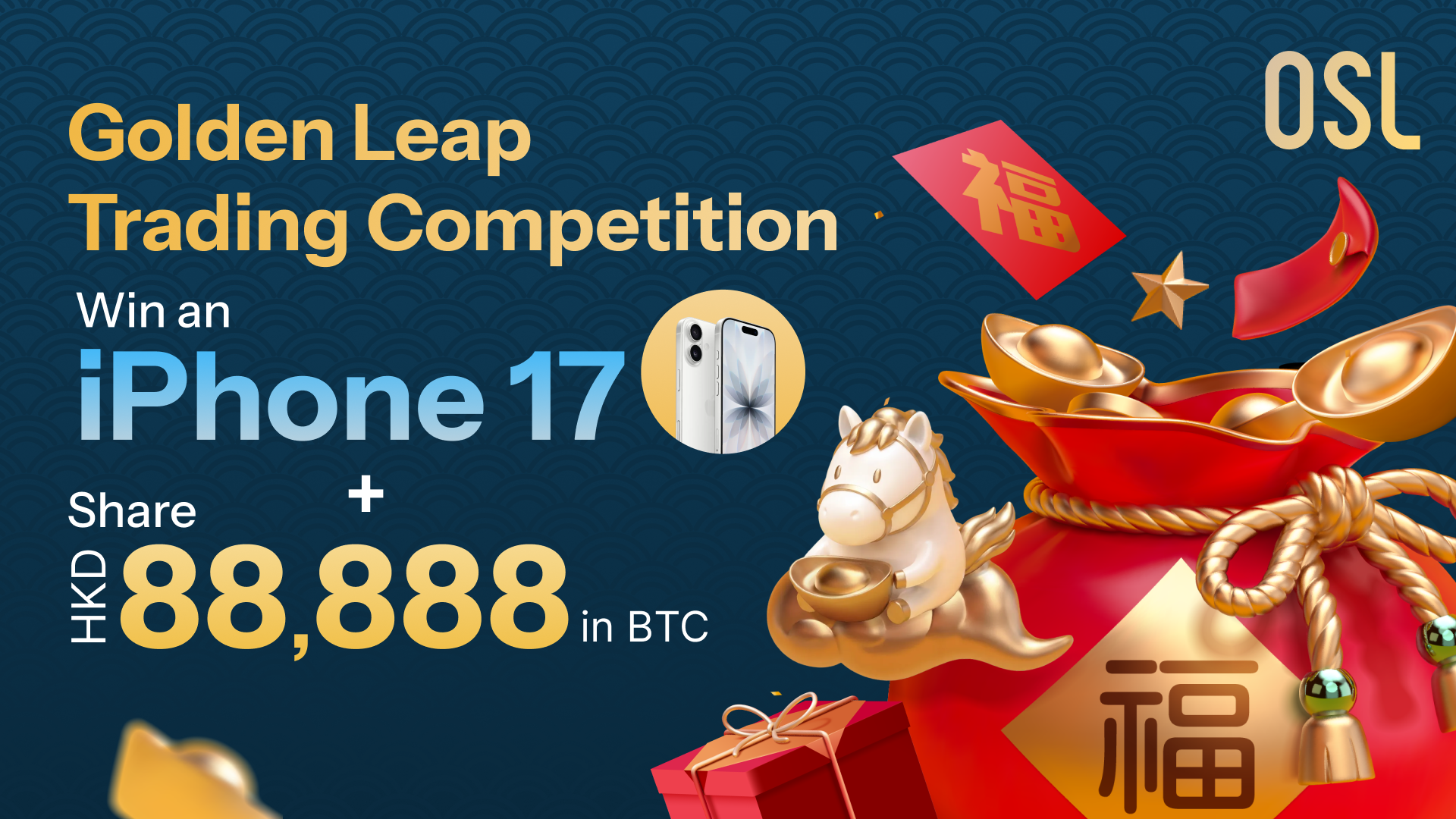 OSL is pleased to announce the launch of the Golden Leap Trading Competition: Win an iPhone 17 & 88,888 HKD in BTC. This campaign is designed to reward our retail users for their trading activity across our core product suites during the festive season.