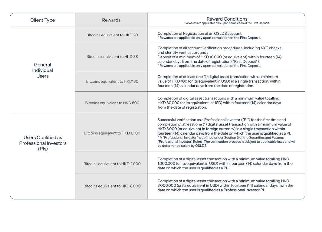 The quantity of the Bitcoin rewards will be calculated based on the Hong Kong dollar (HKD) to Bitcoin exchange rate available on the OSLDS platform at the time of distribution. OSLDS reserves the right, at its sole discretion, to apply a conversion rate it reasonably deems appropriate. OSLDS further reserves the right to deduct any associated costs or fees incurred in the conversion process.