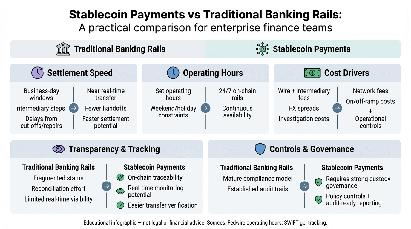 Stablecoin Payments vs Traditional Banking Rails: A Practical Comparison for Enterprises