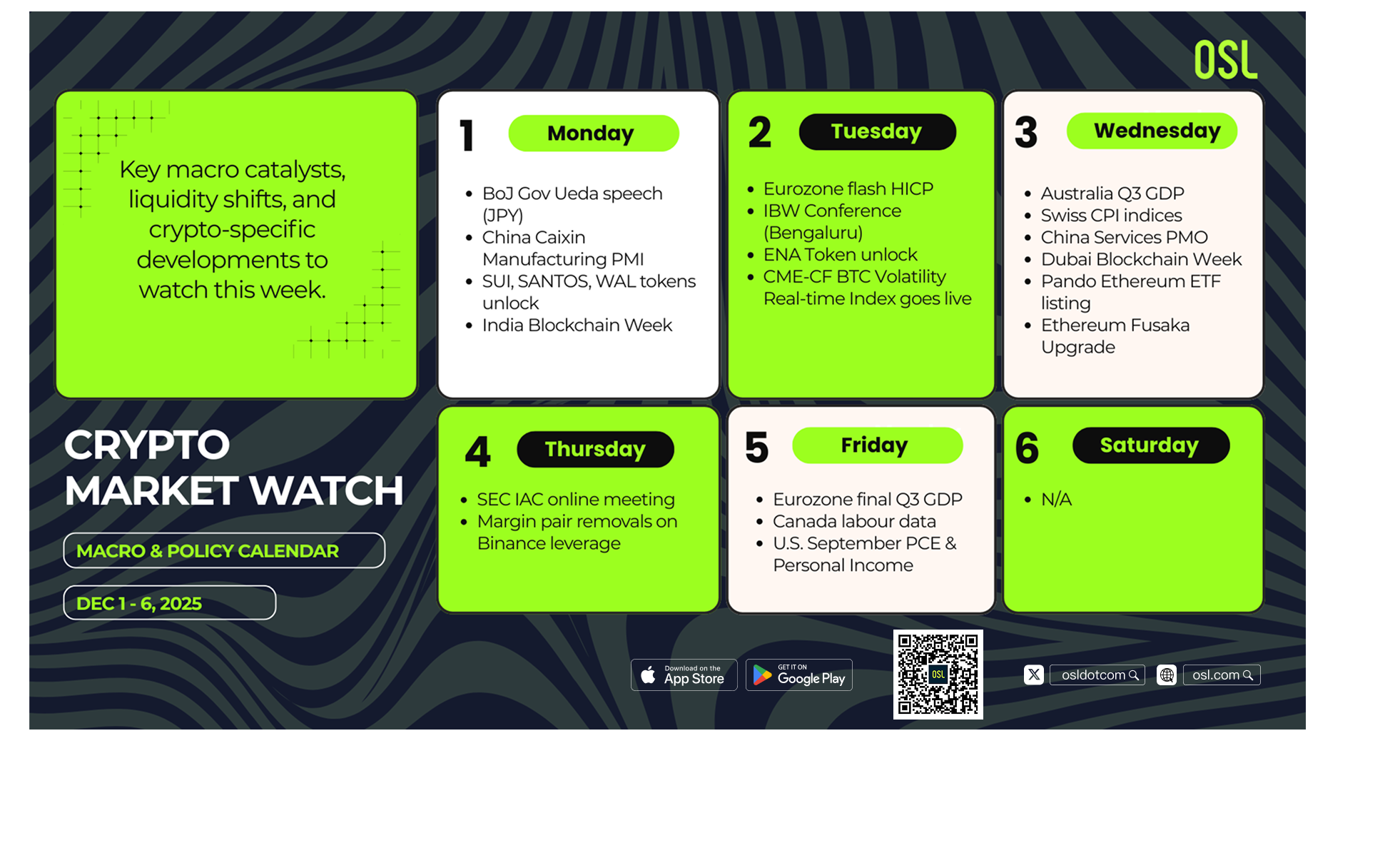 Manufacturing & Services PMIs | China, U.S. | The China Caixin Manufacturing PMI and U.S. ISM Manufacturing PMI on December 1, as well as the China Services PMI and U.S. ISM Services PMI on December 3, will set the tone for global growth expectations. Weak prints reinforce "slow growth + tight policy," a negative mix for high-beta assets like crypto. | Dec 1 – China Caixin Manufacturing PMI, U.S. ISM Manufacturing PMI Dec 3 – China Services PMI, U.S. ISM Services PMI |