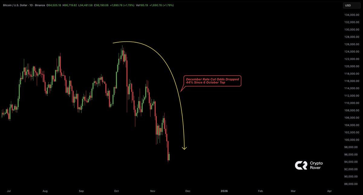 Bitcoin's decline reduces the likelihood of an interest rate cut. Source: Crypto Rover on X