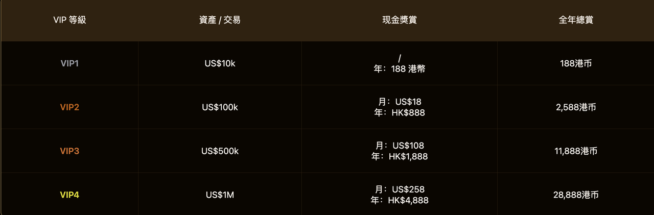 (VIP 用戶可獲得每月現金獎勵,並可額外疊加升級後的最高 HKD 28,888(月月返 + 全年返現 + VIP 年終獎勵)全年回贈機制。)
