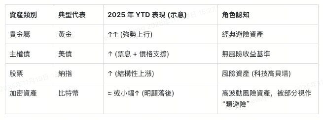 2025年的全球宏觀環境下,比特幣正經歷角色認知的劇烈轉變。本被不少投資者視為“數位黃金”的比特幣,未能在動盪週期中充當理想的避險資產,表現反而大幅落後於傳統避險資產。截至2025年11月中旬,黃金價格年內漲幅高達55%,成為年度表現最好的主要資產,而比特幣年初至今僅上漲約1%,在主要資產中墊底。這一反差前所未有:市場避險情緒高漲時,資金湧向實物黃金等傳統資產,而比特幣卻大幅回撤。這動搖了其“數位黃金”避險神話,促使我們重新思考比特幣在宏觀週期中的定位邏輯。本文將從宏觀流動性、避險錯位與非銀槓桿等角度,分析2025年比特幣角色的變化軌跡,並研判其未來在組合中的定位及演化路徑。