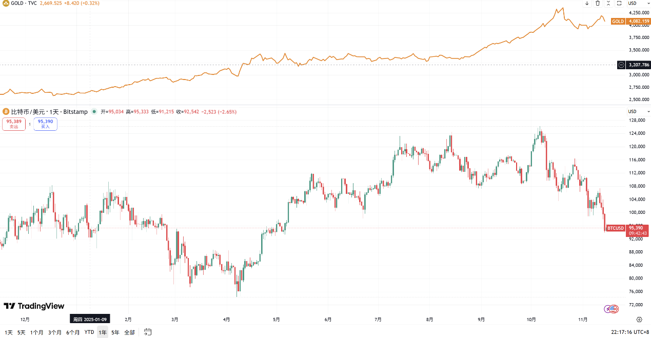 黃金新高,比特幣遇挫。2025年的宏觀動盪中,黃金展現出傳統避險資產本色,屢創新高並吸引大量避險資金;相比之下,比特幣價格走勢疲軟,甚至在市場恐慌時與風險資產一同下跌。11月上旬地緣政治和增長憂慮升溫時,黃金攀至每盎司4200美元上方的紀錄高位,而比特幣卻跌破10萬美元重要關口,回吐全年漲幅。在避險情緒席捲市場之際,貴金屬堅挺走強,而被並列為避險資產的比特幣卻跌落高點,這種背離凸顯了比特幣避險屬性的錯位。市場開始區分 “趨勢投機” 和 “真正對沖”:比特幣的走勢更多反映風險偏好盛衰,黃金則在風險厭惡環境中獨領風騷。