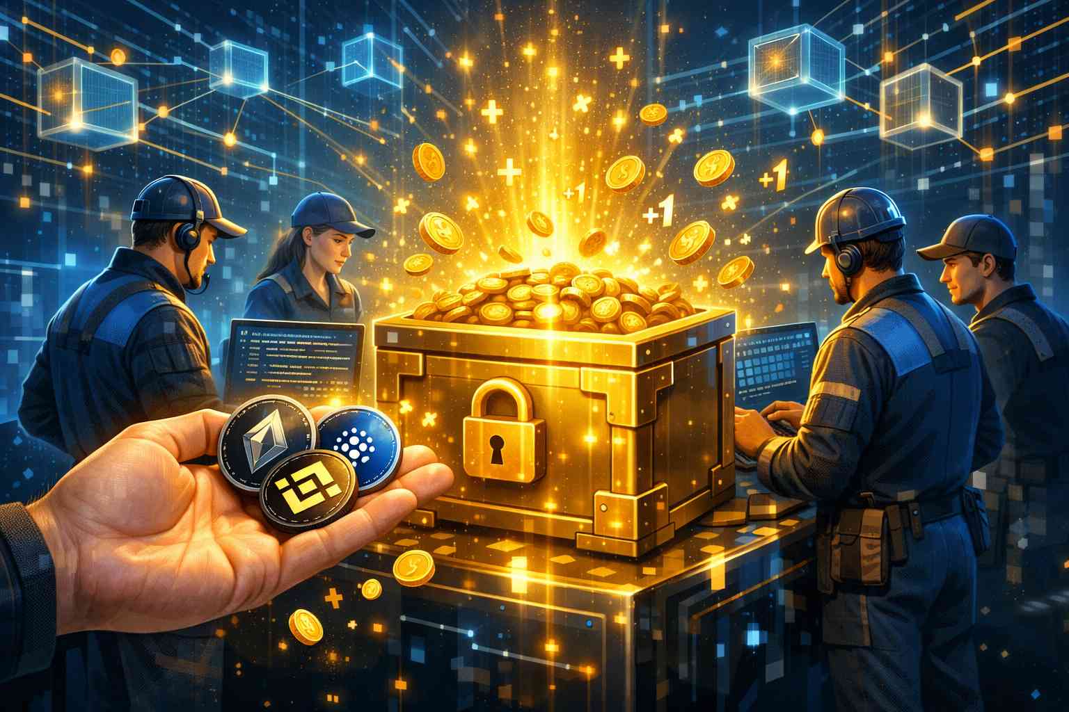 在区块链网络(特别是采用权益证明机制 PoS 的网络)中,为了保证所有的交易数据是真实、可信且不被篡改的,网络需要一群‘验证者’来负责记账。为了防止这些记账人作恶(比如记假账),系统要求他们必须先缴纳一笔‘保证金’。如果他们诚实工作,系统就会奖励他们新的数字资产;如果他们作恶,这笔保证金就会被罚没。