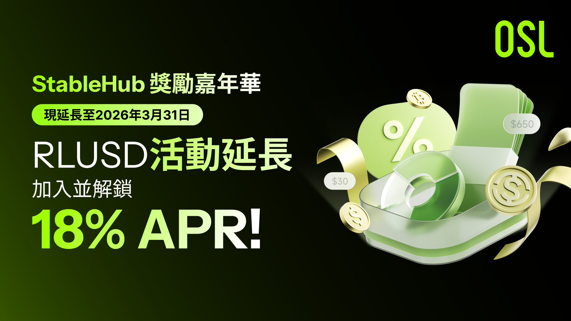 鑑於社區參與的熱情高漲,OSL Global非常高興地宣佈,RLUSD StableHub獎勵嘉年華活動將再次延長至 2026 年 3 月 31 日!自活動推出以來,社區反響極為熱烈。活動一(新用戶專享100%年化獎勵)的獎勵額度已於 2026 年 3 月 9 日 18:10:23(UTC+8)兌換完畢,該部分活動現已結束。活動二(全體用戶可享最高18%年化獎勵)將持續進行,感謝所有用戶的熱情參與!