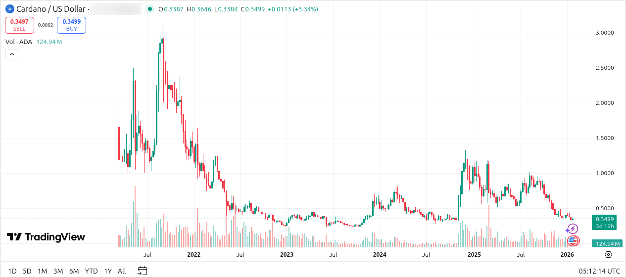 截至 2026 年 1 月,主流交易所的 ADA 報價約為 0.35-0.40 美元。儘管它仍是市值排名靠前的智慧合約平台,但價格較歷史峰值已下跌超過 80%。