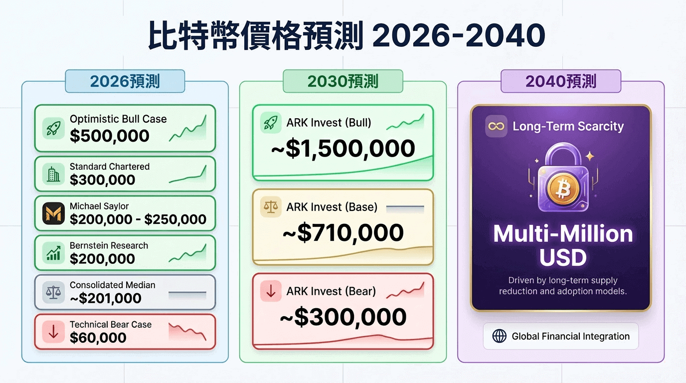 答: 市場上並不存在唯一的「準確」預測。專業分析模型(如 ARK Invest)是基於「數位黃金」的市場滲透率來推算的。目前中性預測約為 70 萬美元,但投資者應關注其背後的邏輯假設而非單一數字。