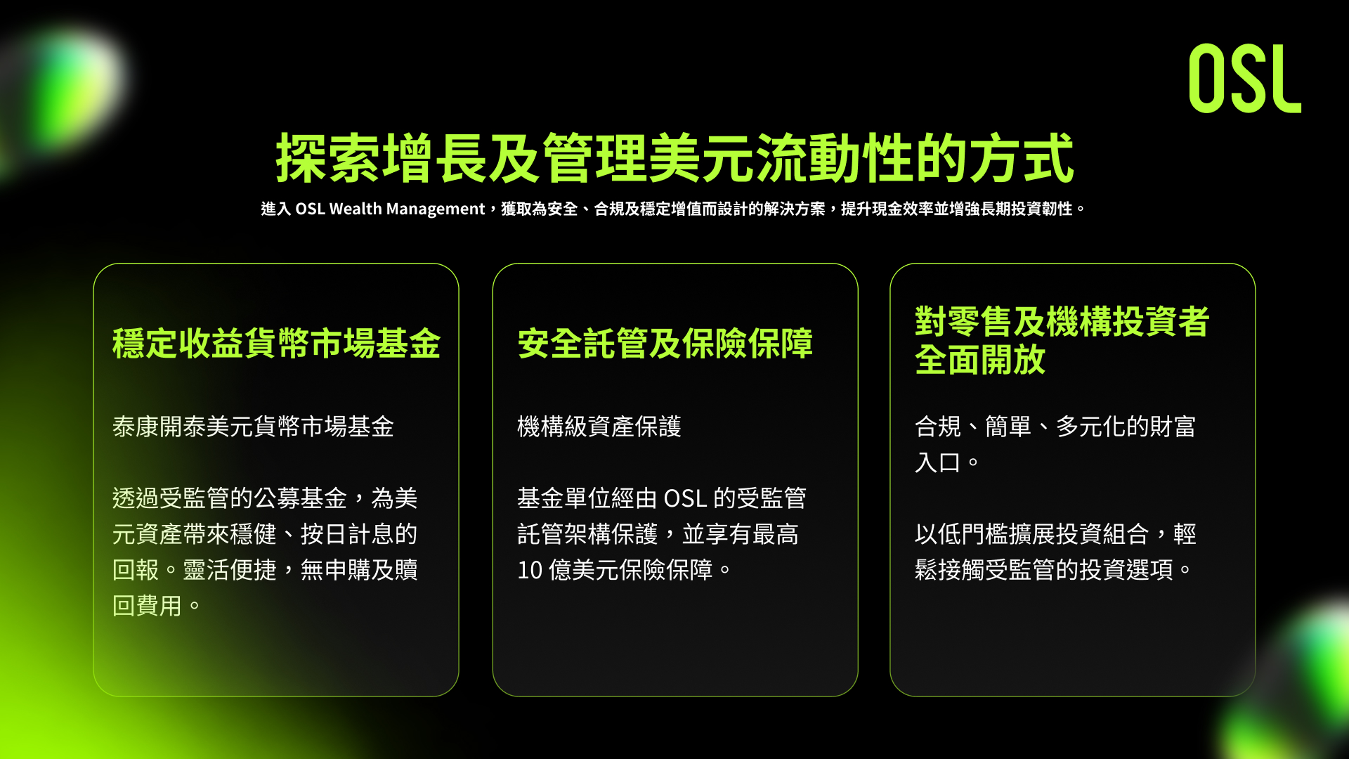 OSL託管為機構投資者提供受香港證監會監管的數字資產託管方案,採用冷儲存架構、10億美元保險及多層安全防護,確保資產安全合規。